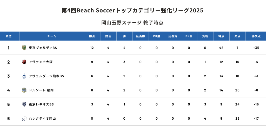 >>岡山玉野ステージ 第4節終了時点順位表